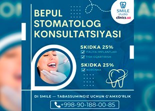 BEPUL stomatolog konsultatsiyasi + SKIDKALAR 25% gacha Di Smile klinikasida — sizning tabassumingiz bunga arziydi!