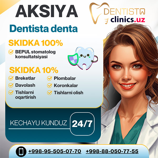 BEPUL stomatolog konsultatsiyasi va barcha xizmatlarga 10% skidka Dentista Denta klinikasida!